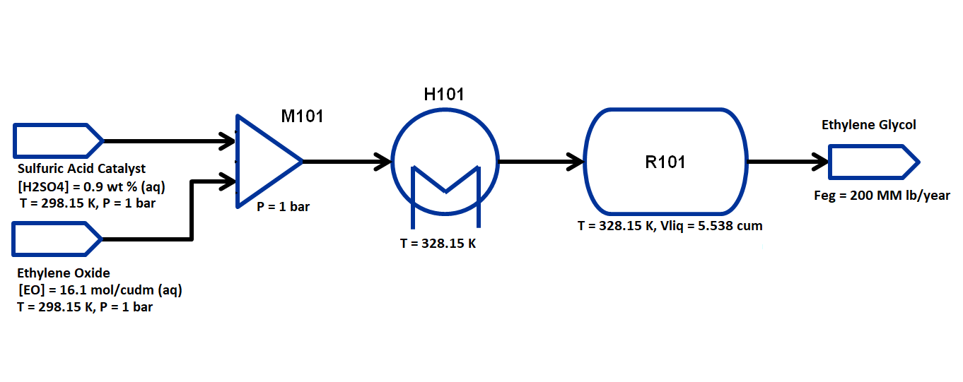 Following the previous example implementing a Continuous Stirred Tank Reactor (CSTR) unit model, we can alter the flowsheet to use a stochiometric (or yield) reactor. As before, this example is adapted from Fogler, H.S., Elements of Chemical Reaction Engineering 5th ed., 2016, Prentice Hall, p. 157-160 with the following chemical reaction, property packages and flowsheet. Unlike the previous two reactors which apply performance equations to calculate reaction extent, this simplified reactor model neglects all geometric properties and allows the user to specify a yield per reaction. The state variables chosen for the property package are molar flows of each component by phase in each stream, temperature of each stream and pressure of each stream. The components considered are: ethylene oxide, water, sulfuric acid and ethylene glycol and the process occurs in liquid phase only. Therefore, every stream has 4 flow variables, 1 temperature and 1 pressure variable.